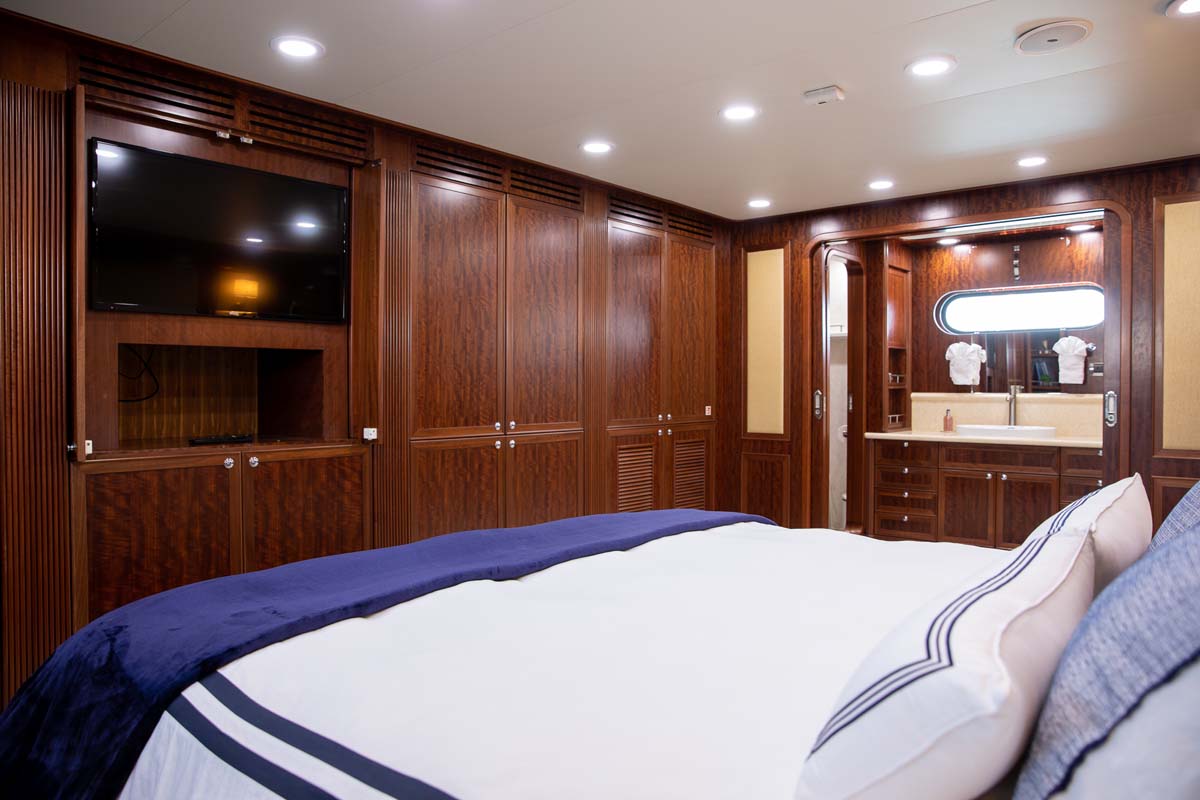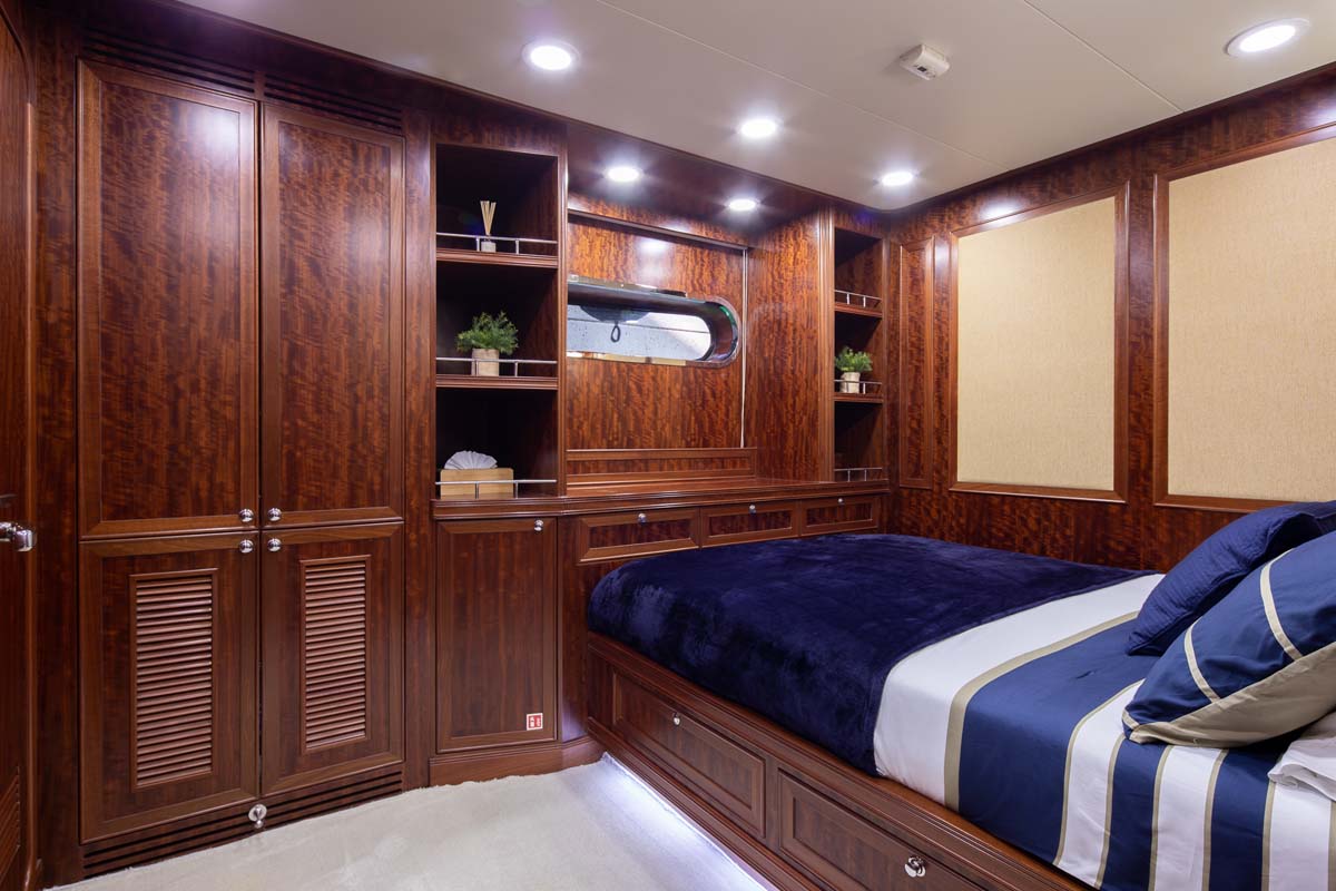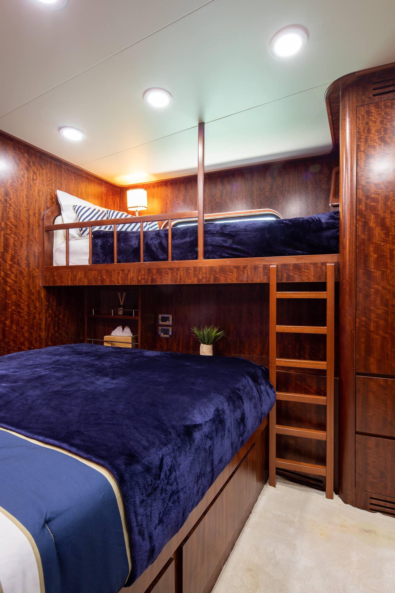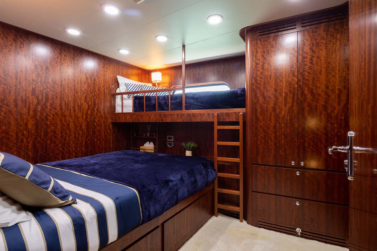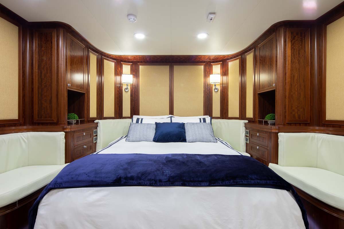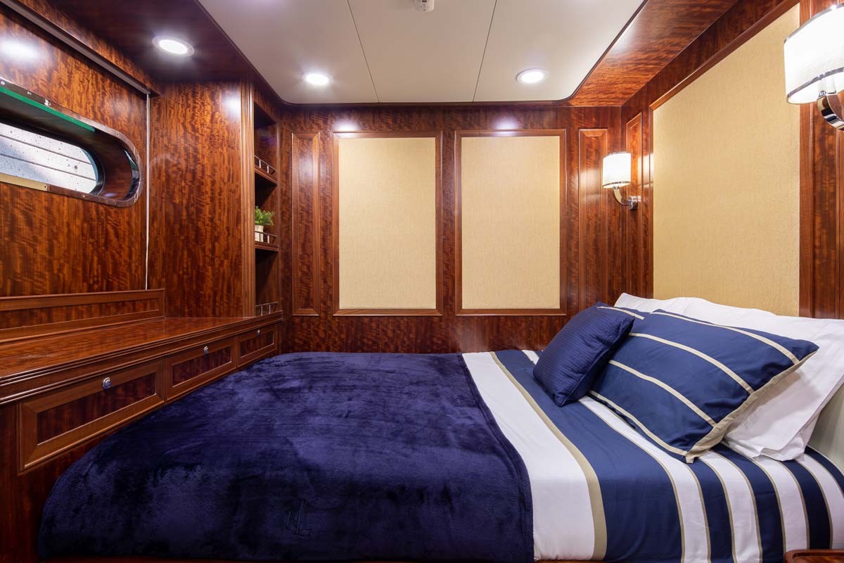 Inside, the feeling is more like a country home than a compact motor yacht. High ceilings, a wide beam, and a notably generous main saloon create a space that invites everyone together to gather, relax, and spend time together. Accommodation is arranged for up to nine guests in four cabins, including a full-beam master suite located midship on the lower deck for quiet, stable nights at anchor. The additional cabin with a Pullman berth is ideal for children, making her particularly well-suited to family charters.