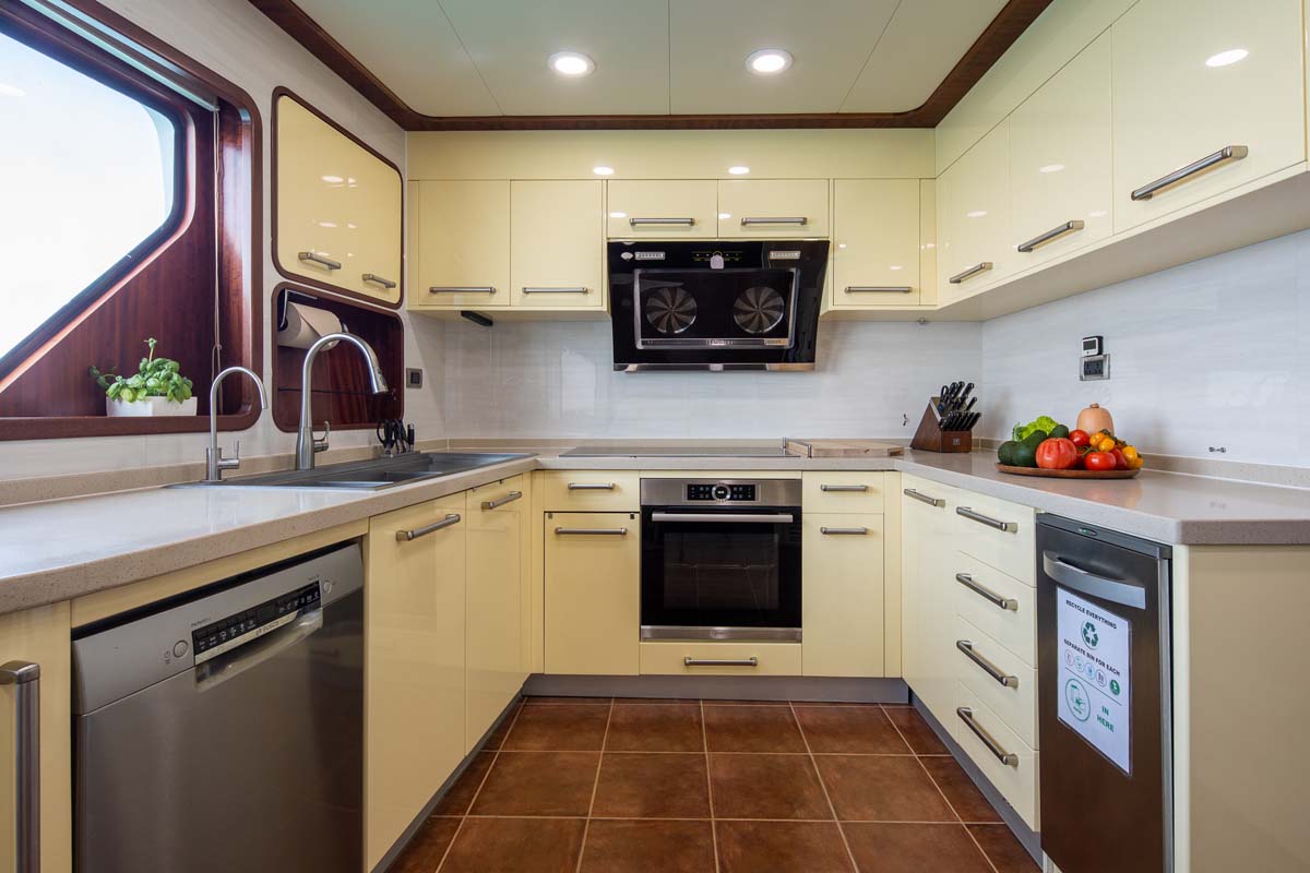 She was designed for families who see chartering as a chance to explore rather than simply unwind. Her steel hull and 6,000 nautical mile range open the door to longer itineraries and quieter cruising grounds, while a shallow 2.6-metre draft and registration below 24 metres allow access to anchorages and ports that remain out of reach for larger yachts. Stabilisers underway and at anchor ensure calm cruising, and her low fuel consumption supports extended journeys without compromising.