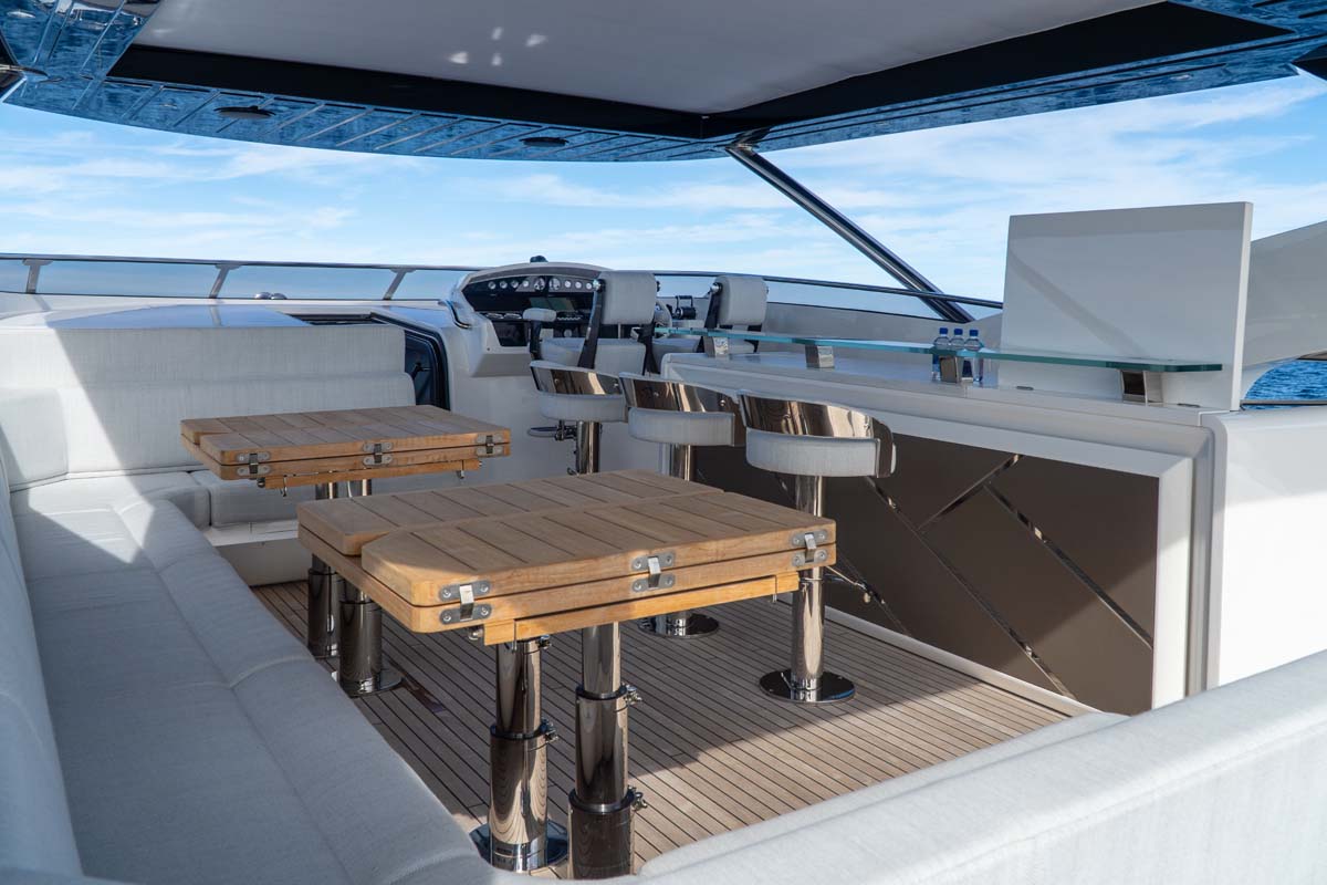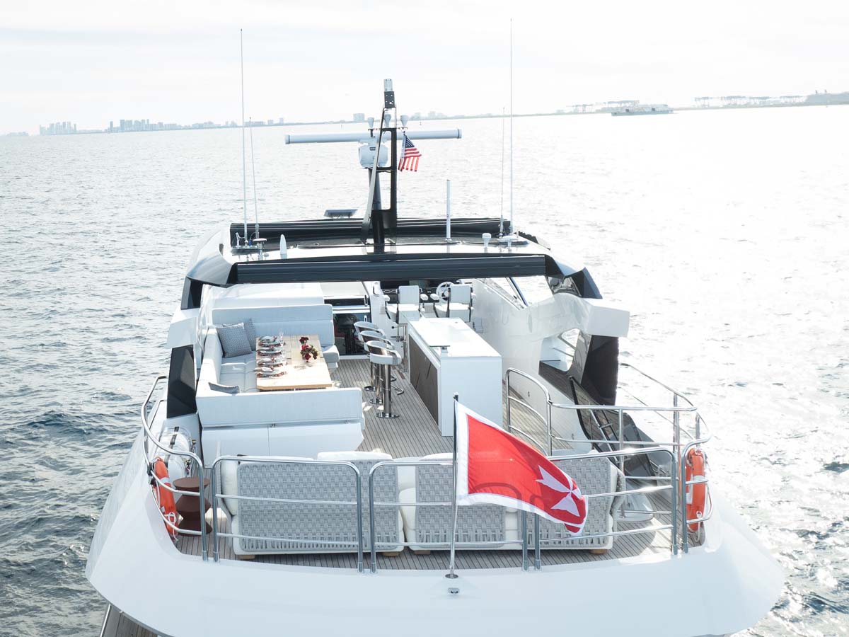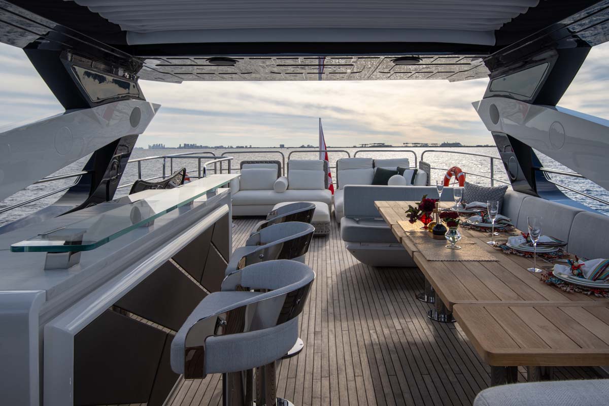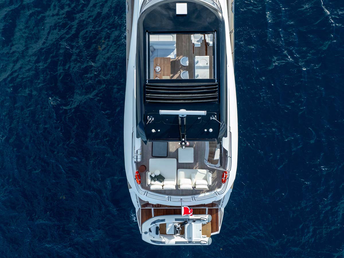 - 01 — 03 She features a collection of open-air spaces designed for dining, sunbathing, and socialising, centred around a generous flybridge, and complemented by her hydraulic swim platform.