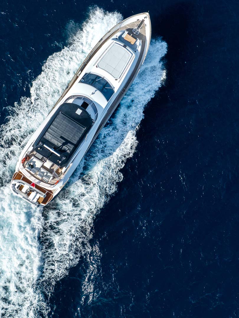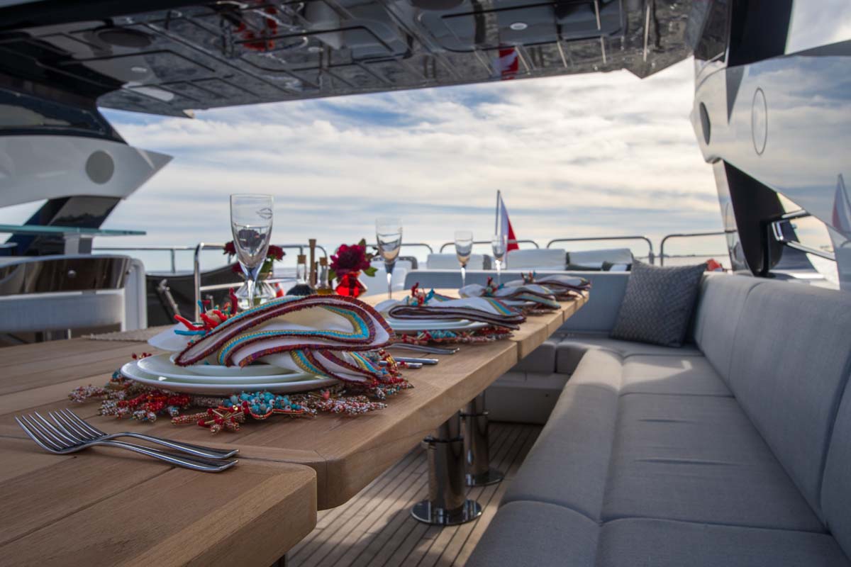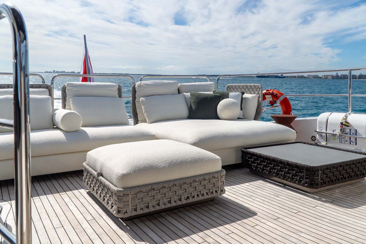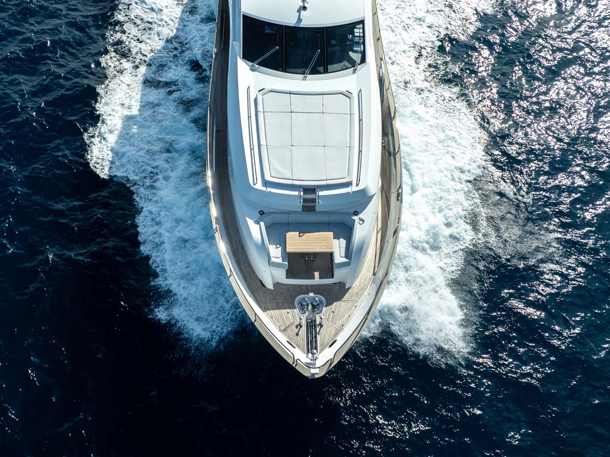 - 01 — 03 She features a collection of open-air spaces designed for dining, sunbathing, and socialising, centred around a generous flybridge, and complemented by her hydraulic swim platform.