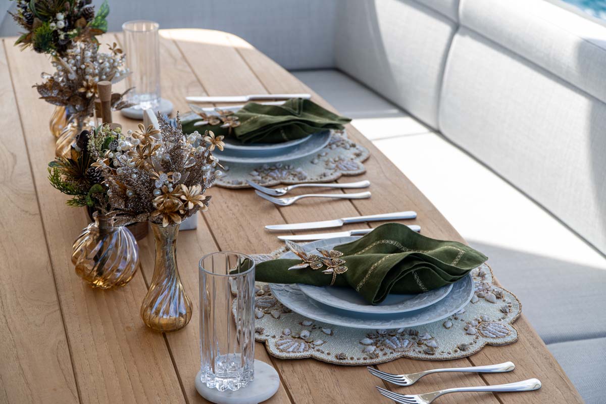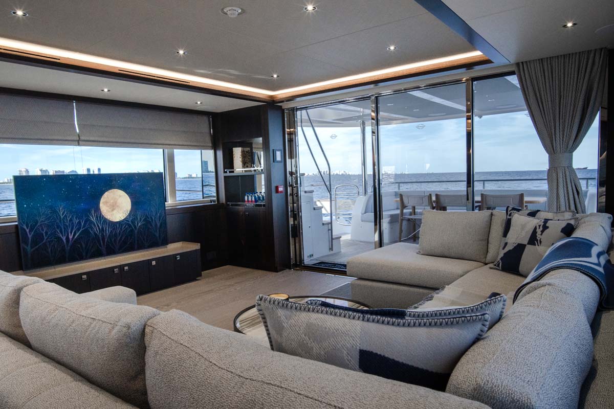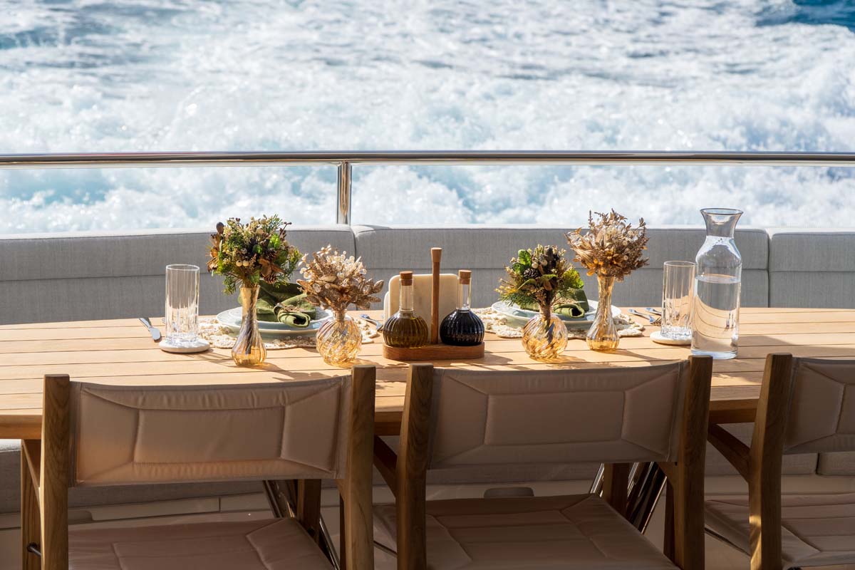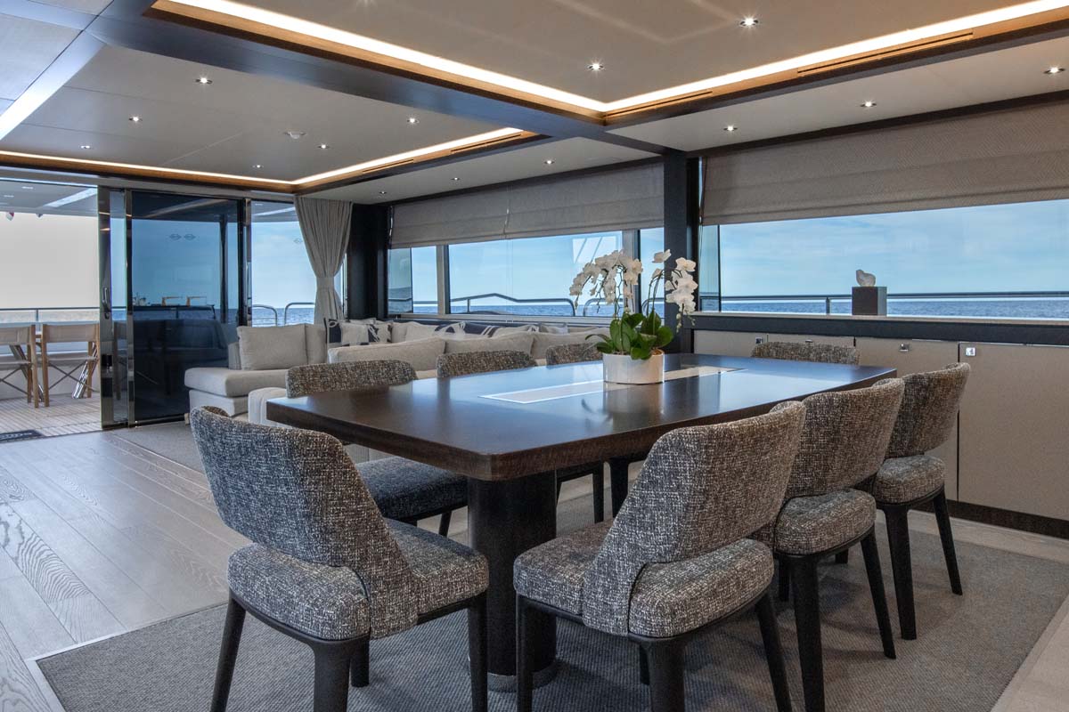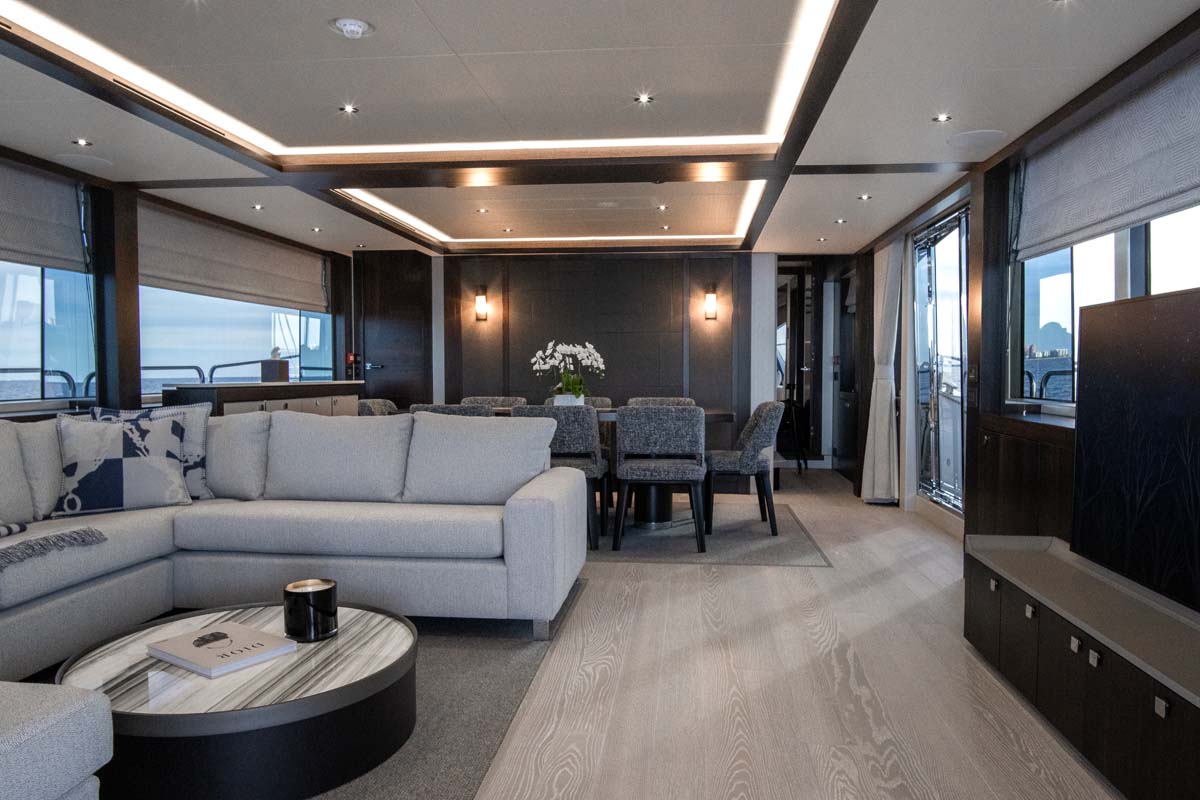 Her interiors are calm and contemporary, with darker tones lending a slightly masculine edge. Full-height windows bring the outside in, creating an easy rhythm between her interior lounges and open decks. The main salon opens to a fold-down balcony to starboard, a small but memorable detail that quickly becomes a favourite spot for morning coffees and evening aperitifs.