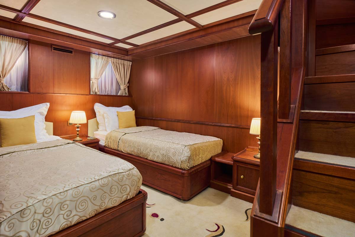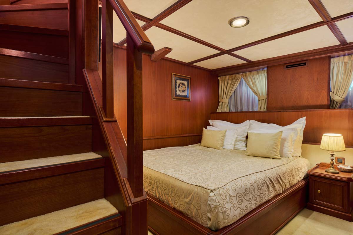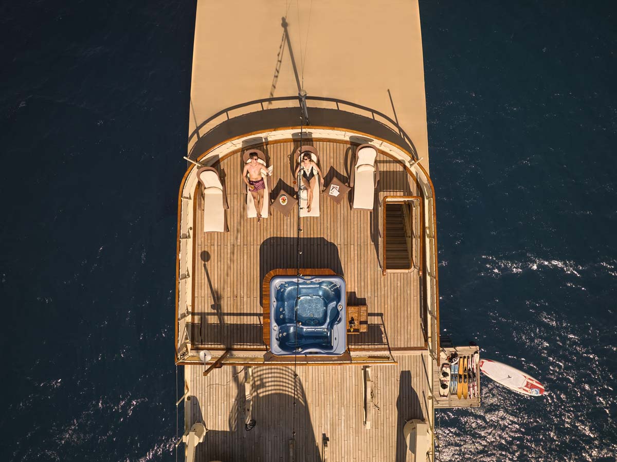 She is now a successful charter yacht, counting among her guests royalty and celebrities alike—His Majesty King Frederik X of Denmark is, reportedly, a fan; Bono once whiled away a day upon her sun-warmed teak decks. She can accommodate up to 12 guests across seven cabins, including five double cabins and two twins. She is helmed by Captain Vojo Vujsic—a sailor in his youth and a former pilot—working alongside Ivan Puco, a creative chef specialised in Mediterranean cuisine, and well-studied in both pastry and dessert making.
