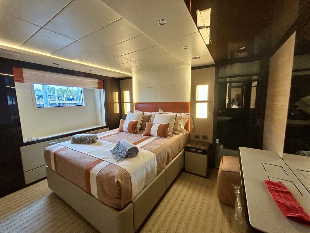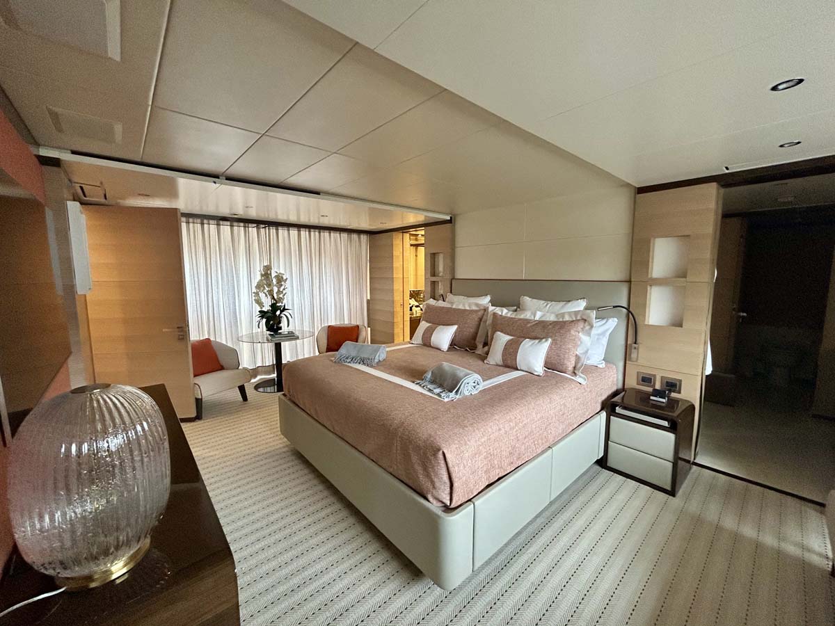 This sense of openness continues into the main-deck master suite. A full-beam home-away-from-home, it features a private study and ensuite equipped with both a steam shower and sauna—wellness features only usually seen on much larger vessels.