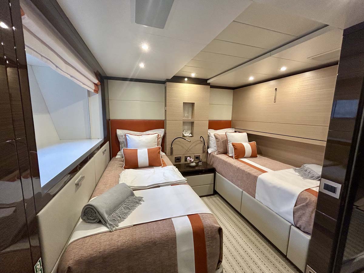 In the main salon, these floor-to-ceiling windows replace bulkheads, allowing the Mediterranean light to play across an interior defined by warm, soft tones and pops of burnt orange—a nod to the owner’s Texas Longhorns roots.