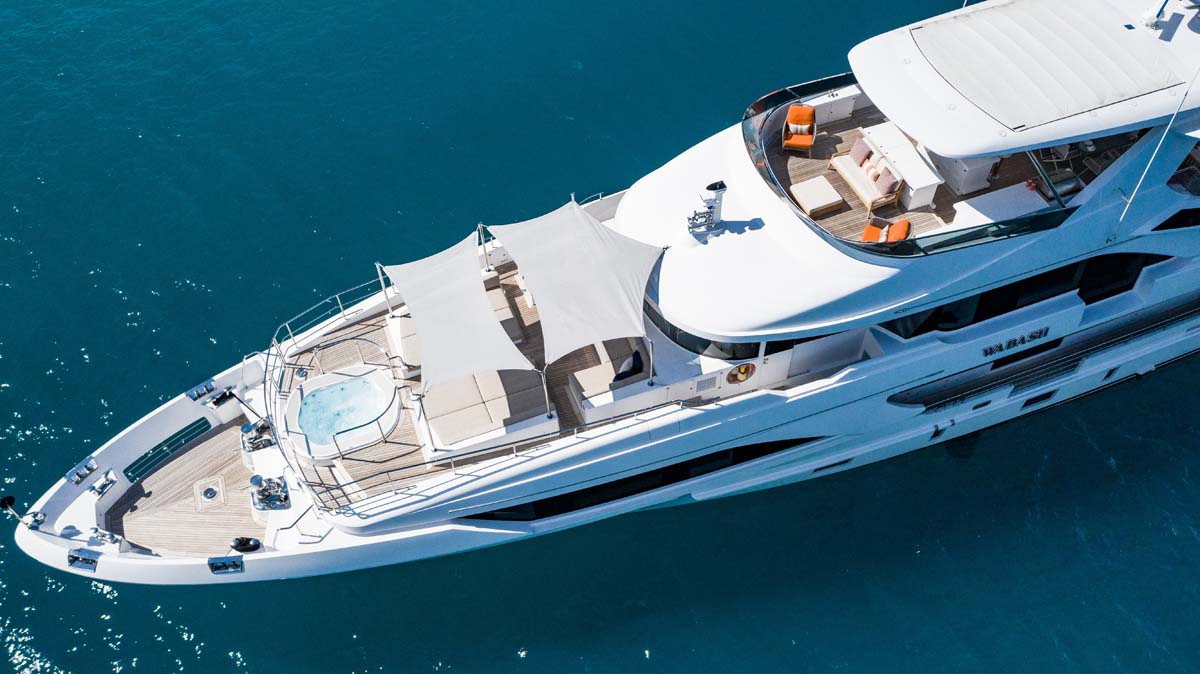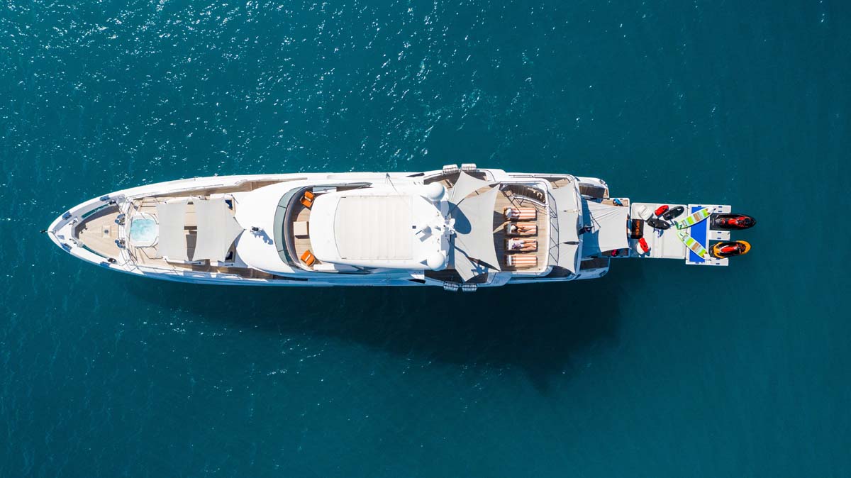 Outside, life centres around the 100-square-metre sundeck, a space designed for all hours of the day. A midship bar serves as the social hub, while the aft deck offers a wide, flat expanse for morning yoga or evening cocktails. Forward, a secluded seating nook provides a quiet spot for those seeking privacy. On the foredeck, a Jacuzzi and sunpads create a sweet little terrace for watching the yacht pull into port.